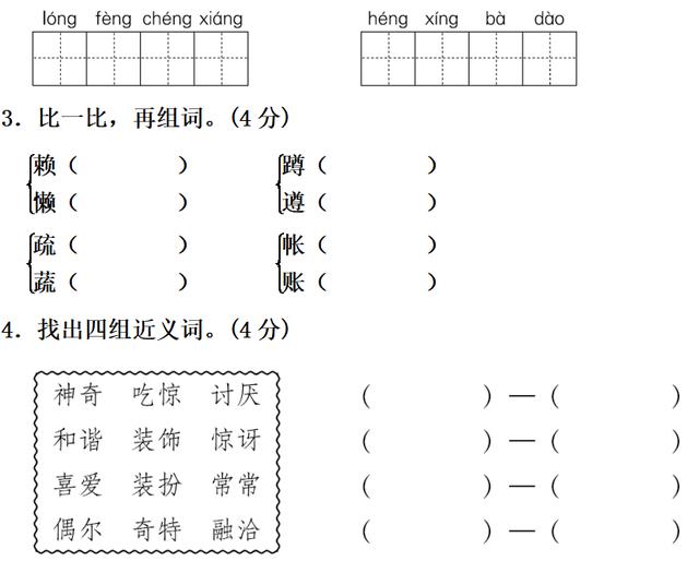 4.神奇—奇特 吃惊—惊讶 和谐—融洽 装饰—装扮