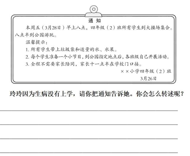 二、6.示例:玲玲,本周五(3月28日),我们带上垃圾袋和适量的水果、水,八点钟到大操场集合,八点半去公园游玩。我们每个人都要准备一个小节目,到时候在班级活动时表演。家长不能陪同,他们十一点半到学校门口接我们。