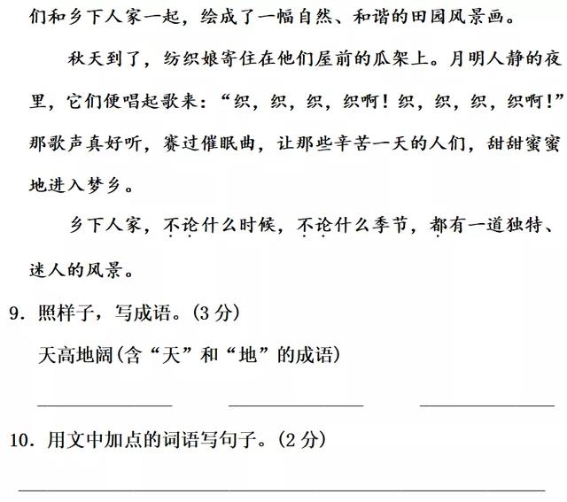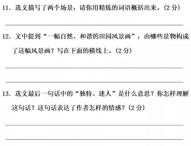 13.“独特”指独有的、特别的。“迷人”指使人陶醉,使人迷恋。这句话是说乡下人家在任何时候,在任何季节都有着自己特别的很吸引人的朴实之美、自然之美、恬静之美、和谐之美。表达了作者对乡村生活的热爱和由衷赞美。