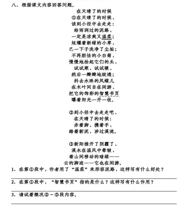 3.在天晴了的时候,应该到哪里去走走呢?到小径中去走走。( )