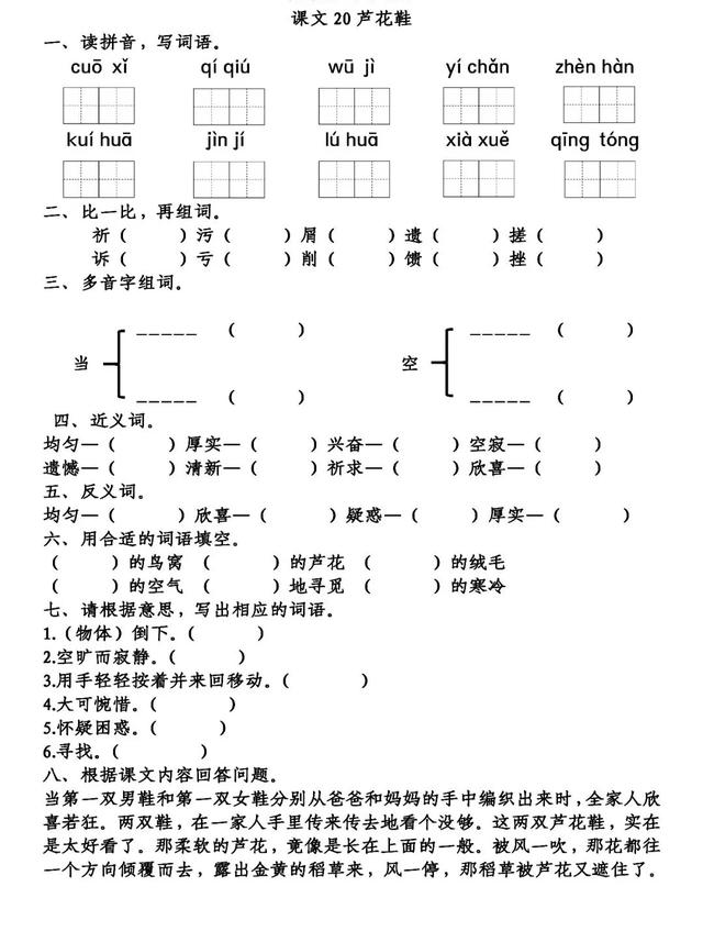 2.《芦花鞋》主要讲了青铜为了增加家里收入,编织芦花鞋,跑进风雪里,冒雪卖芦花鞋,赤脚踏雪回家几件事,最后为了满足一个顾客的需求,脱下自己的穿的鞋卖给对方,表现了生长在艰苦环境中的孩子顽强的性格和善良的心灵。