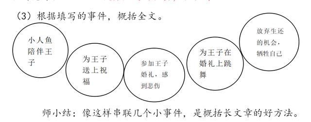 师示范:以第9段为例,“小人鱼不禁想起她第一次浮在海面上的情景……她于是跳起舞来,飞快地旋转着,就像……” 小人鱼为王子在婚礼上跳舞(谁+干什么),抓住主要人物主要事情来概括。