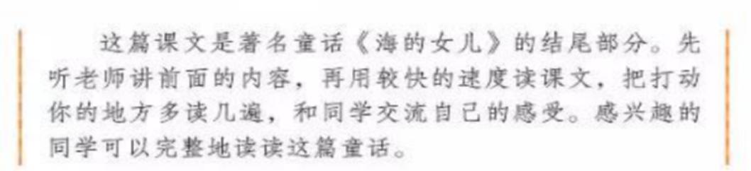 由于选文篇幅较长,并且是《海的女儿》结尾部分,对于没读过原文的孩子来说学习可能存在困难,故在上课开始,先听老师讲故事前面的内容,从而引发对课文阅读的兴趣,课后自主阅读整篇童话故事。