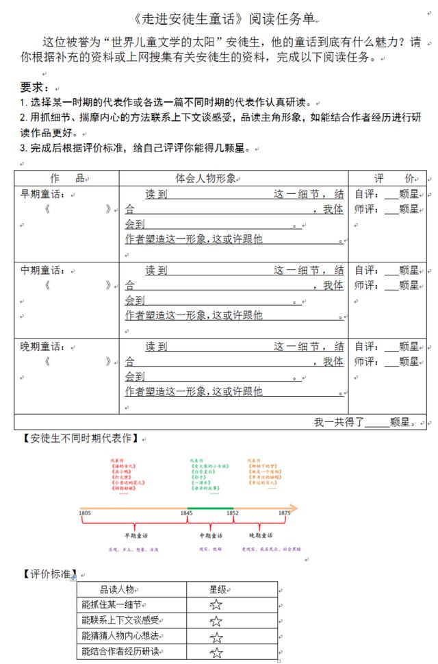 4.作业布置:对照补充资料,完成阅读任务单,从三个时期各选一篇童话,进行人物形象品读。
