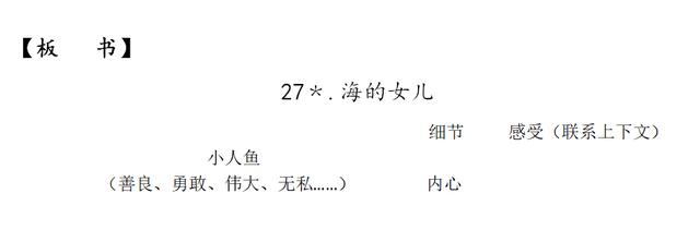2. 借助“细节+感受”的方法品读人物,抓关键词句揣摩小人鱼的心理,深入体会小人鱼的善良,对爱执着追求的人物形象。