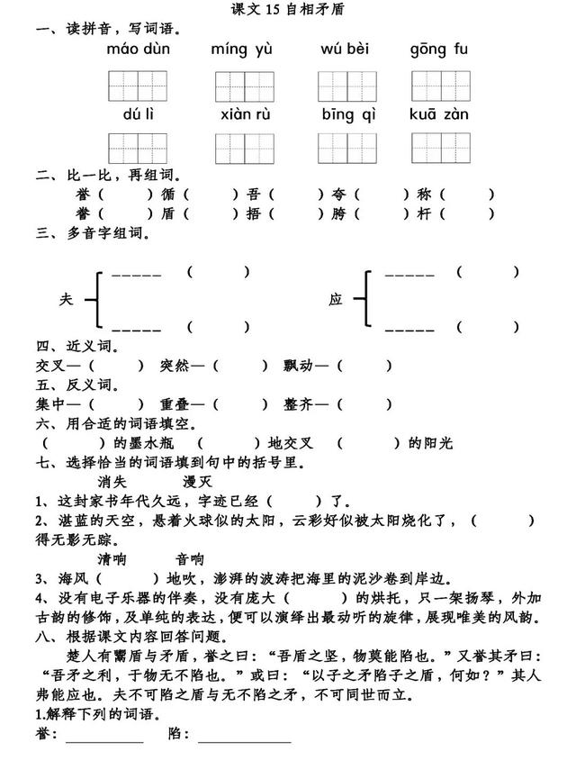誊(誊写)盾(矛盾)捂(捂脸)胯(胯下)杆(杆子)