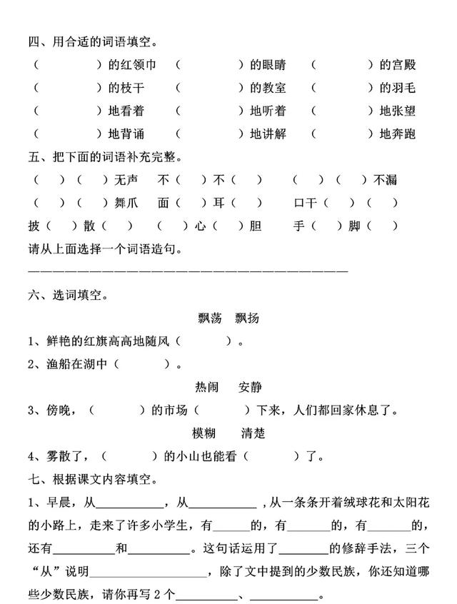 1、早晨,从山坡上,从坪坝里,从一条条开着绒球花和太阳花的小路上,走来了许多小学生,有汉族的,有傣族的,有景颇族的,还有阿昌族和德昂族的。这句话运用了排比的修辞手法,三个“从”说明学生来自不同的地方,除了文中提到的少数民族,你还知道哪些少数民族,请你再写2个白族、苗族。