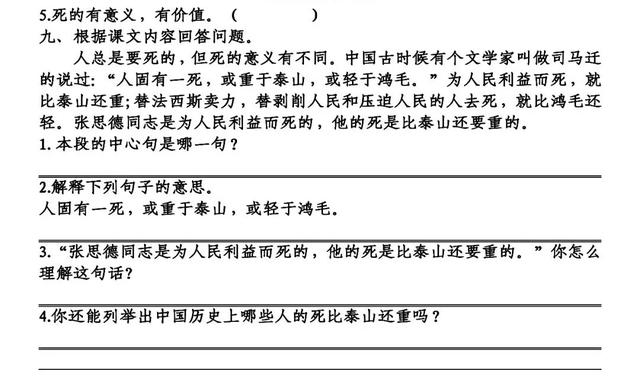 (1)本来、有的人(2)人终究免不了一死,但死的价值不同,为了人民正义的事业而死就比泰山还重,而那些自私自利,损人利已的人之死就比鸿毛还轻。(3)泰山:山东泰安的泰山,比喻伟大;鸿毛 :也是鸟的羽毛,比喻渺小(4)他是为人民利益而死的;李大钊、雷锋