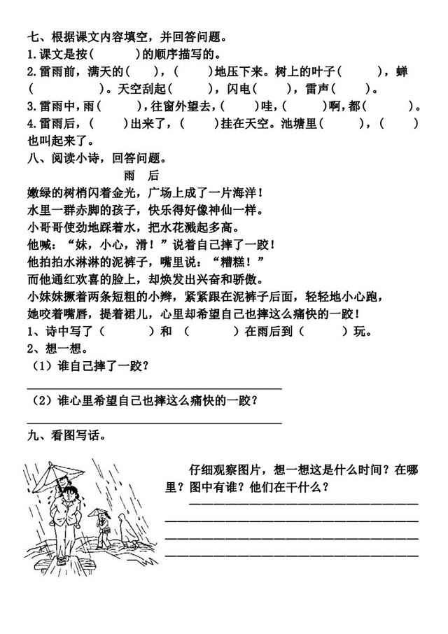 1、诗中写了( 小哥哥)和 (小妹妹)在雨后到(广场)玩。