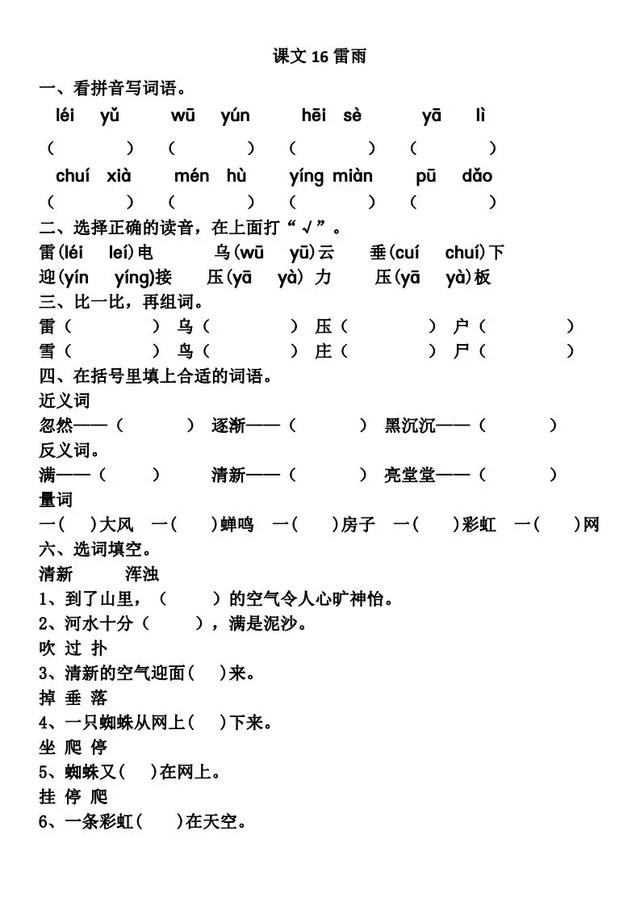 2.雷雨前,满天的(乌云 ),( 黑沉沉 )地压下来。树上的叶子( 一动不动 ),蝉( 一声也不叫 )。天空刮起(大风 ),闪电(越来越亮),雷声(越来越响)。